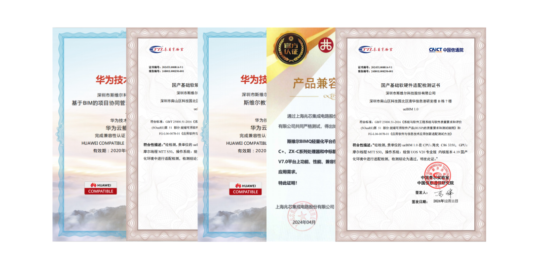 目前,斯维尔自主研发的ueBIM、BIMQ、BIM5D、斯维尔教育云平台、智慧工地、工程计价等多款产品已通过兆芯、飞腾、鲲鹏、海光、AMD64、华为鲲鹏云、统信UOS、麒麟等国产软硬件环境严苛认证,确保全国产化环境下的稳定高效运行,为“中国建造”数字化、智能化发展打下坚实基础。