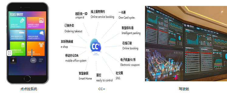 数字赋能:通过“点点控”,绿色空间操作系统,管理园区所有的空间和公共设施,掌握空间与设施的全生命周期数据。 CC+ 绿色空间智慧终端,可通过 CC+ 平台快速便捷地获取和使用各种服务。总裁驾驶舱:绿色空间大数据集成,涵盖园区招商、企业、物业、商业消费、停车场、能耗及工程建造等各方面的实时统计数据。