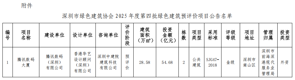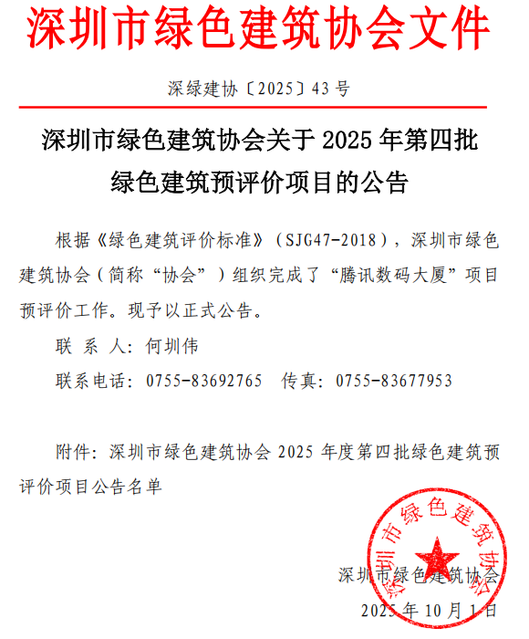 深圳市绿色建筑协会关于2025年第四批绿色建筑预评价项目的公告