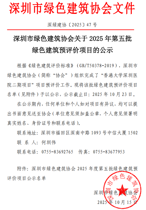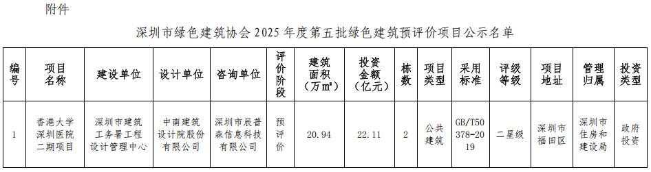 深圳市绿色建筑协会关于2025年第五批绿色建筑预评价项目的公示