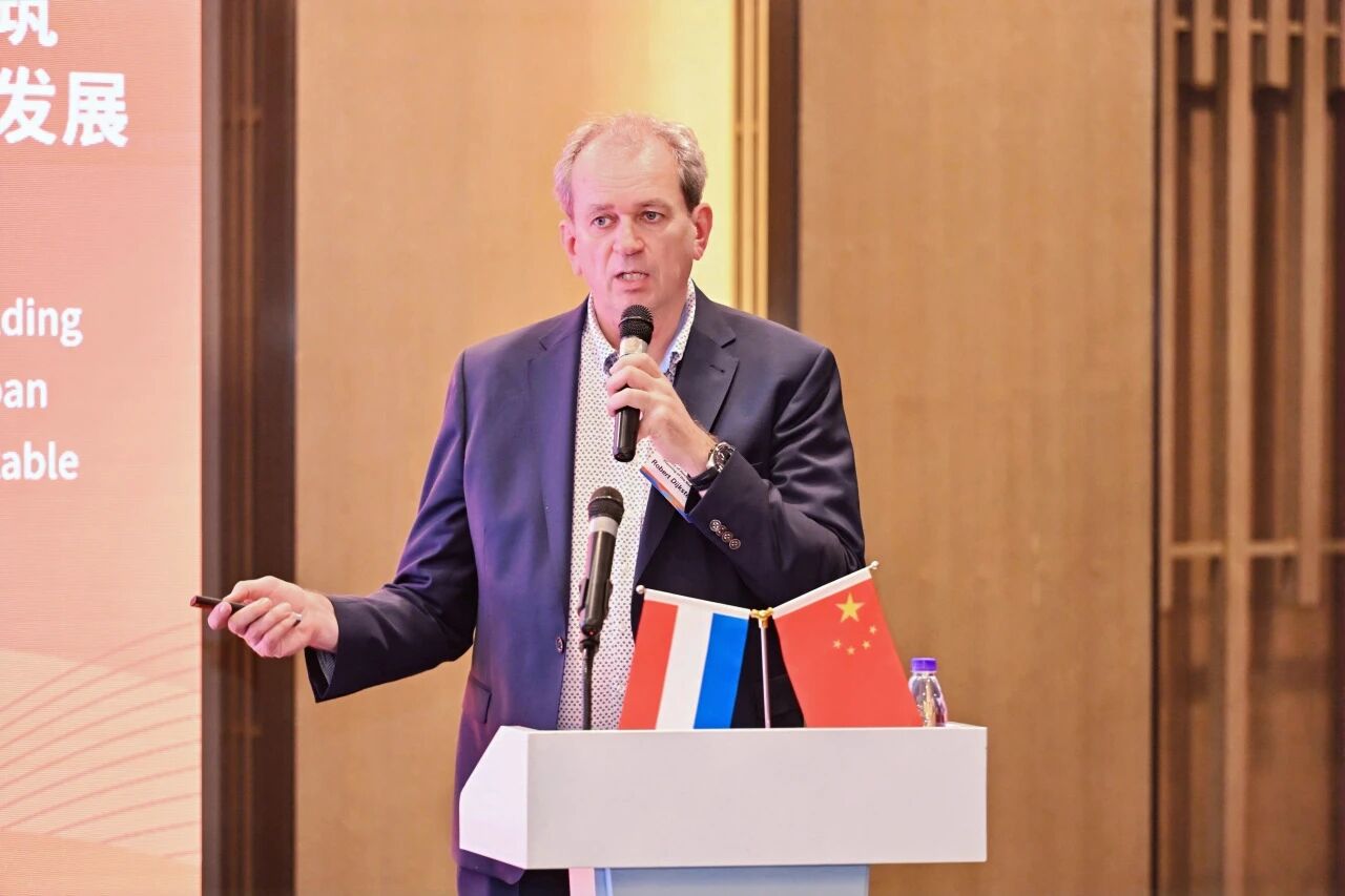 荷兰住房与空间规划部可持续建筑特使Robert Dijksterhuis先生担任本次荷兰可持续建筑环境商务代表团的团长。他长期关注欧盟委员会绿色协议计划与荷兰建筑环境气候政策之间的相互作用,会上,他以“荷兰的可持续建造环境”为主题,分享了荷兰践行绿色发展的路径与策略,并对本次会议提出了推动企业深入合作的期许。