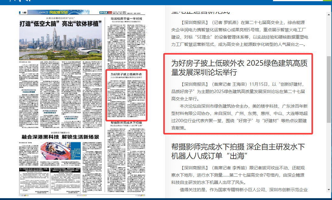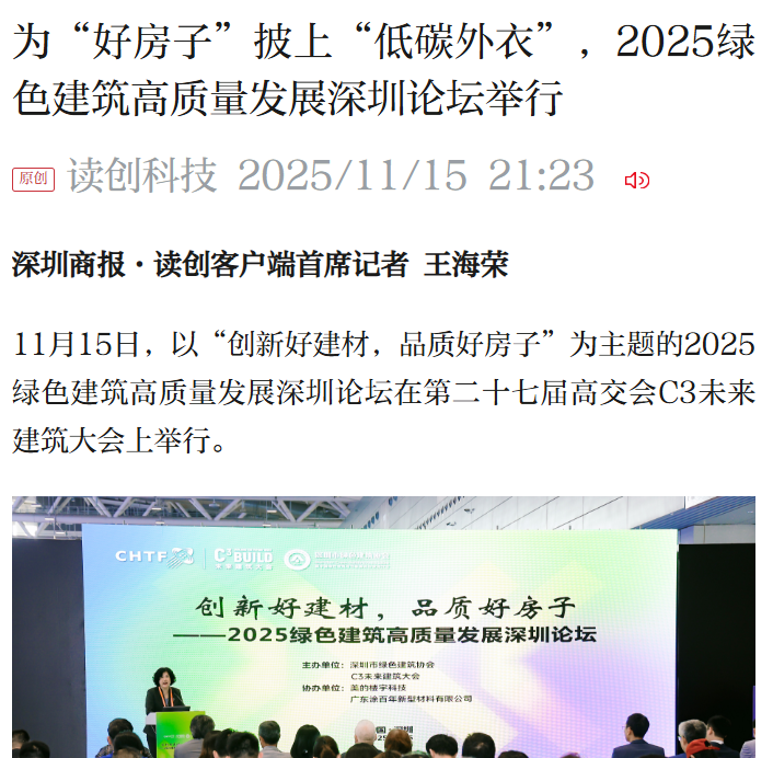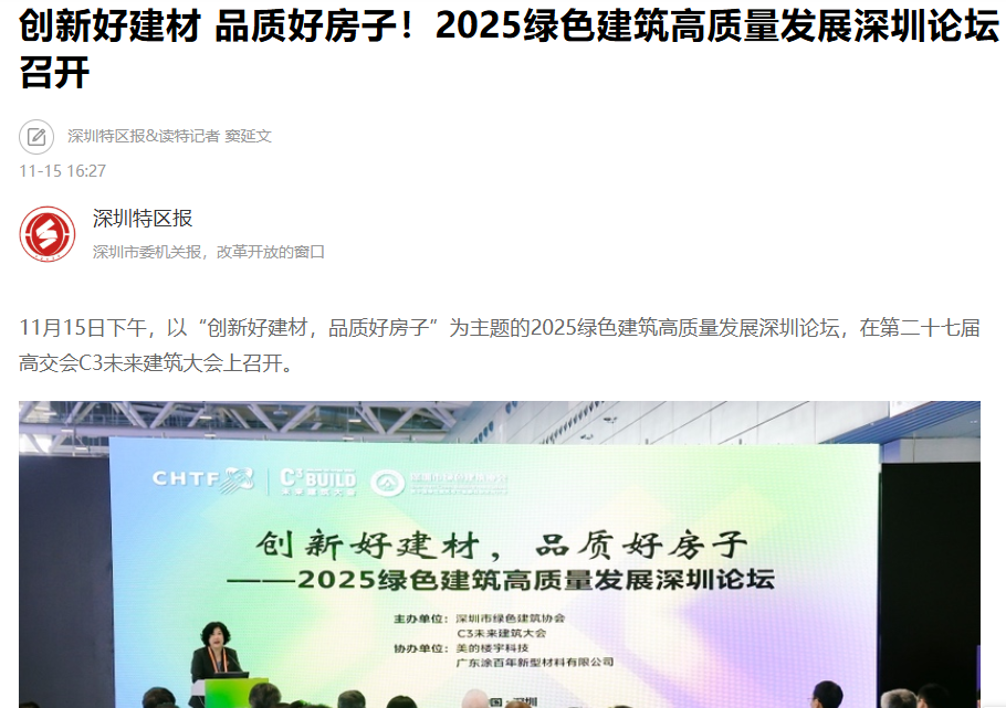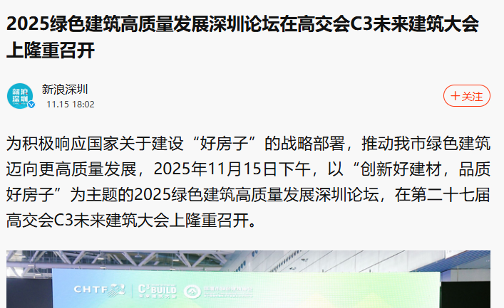 为积极响应国家关于建设“好房子”的战略部署,推动我市绿色建筑迈向更高质量发展,2025年11月15日下午,以“创新好建材,品质好房子”为主题的2025绿色建筑高质量发展深圳论坛,在第二十七届高交会C3未来建筑大会上隆重召开。