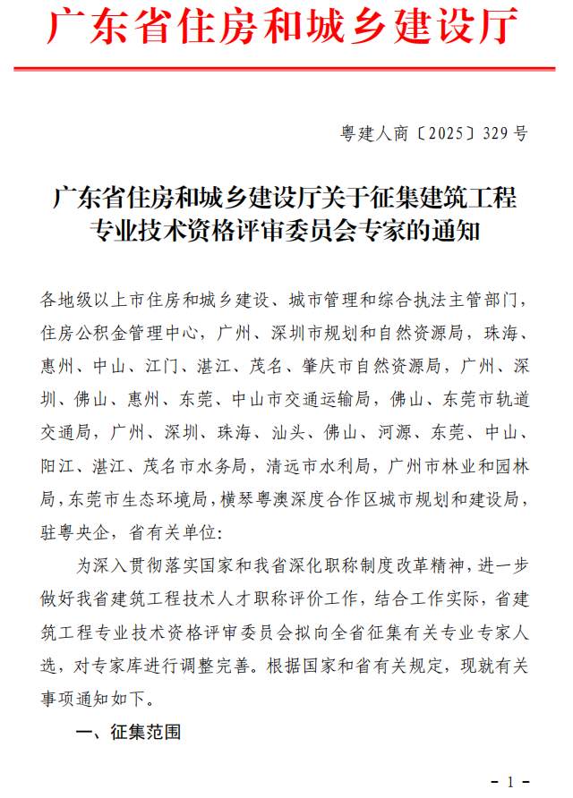 附件1:广东省住房和城乡建设厅关于征集建筑工程专业技术资格评审委员会专家的通知