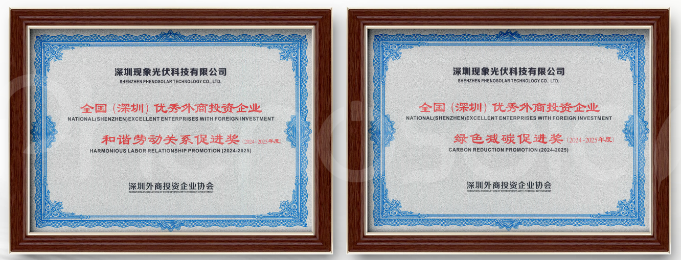 近日,在深圳外商投资协会主办的“2025年全国(深圳)优秀外商投资企业”表彰大会上,深圳现象光伏科技有限公司一举斩获“和谐劳动关系促进奖” 与“绿色减碳促进奖”双重殊荣。该评选自1989年起已连续举办36届,是国内外商投资领域极具权威性的品牌活动。本届从深圳逾1.75万家外资企业中优中选优,仅191家企业脱颖而出。现象光伏能同时斩获双奖,标志着其在“内部治理”与“绿色创新”两个维度均达到行业标杆水平,赢得了高度认可。