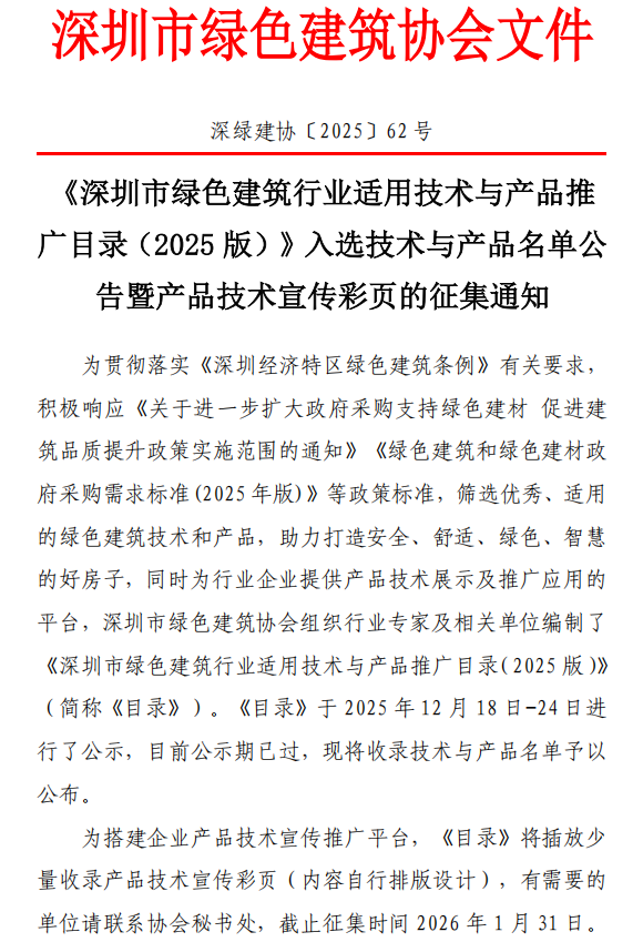 《深圳市绿色建筑行业适用技术与产品推广目录(2025 版)》入选技术与产品名单公告暨产品技术宣传彩页的征集通知