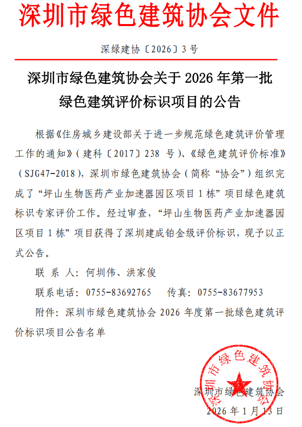 深圳市绿色建筑协会关于2026年第一批绿色建筑评价标识项目的公告