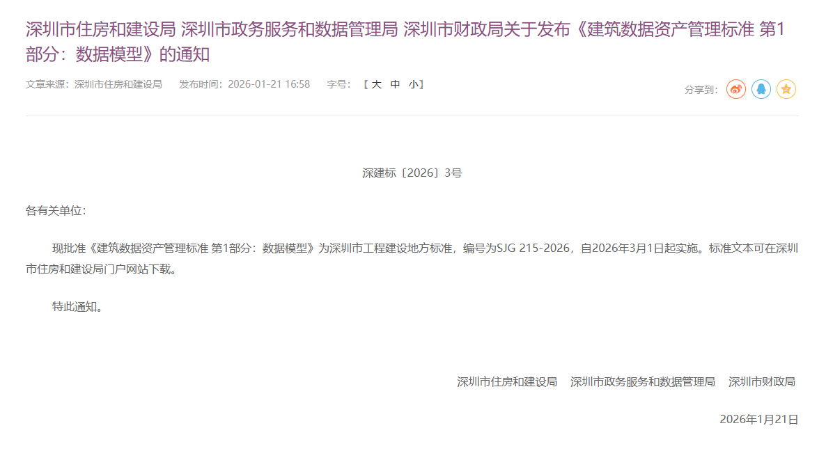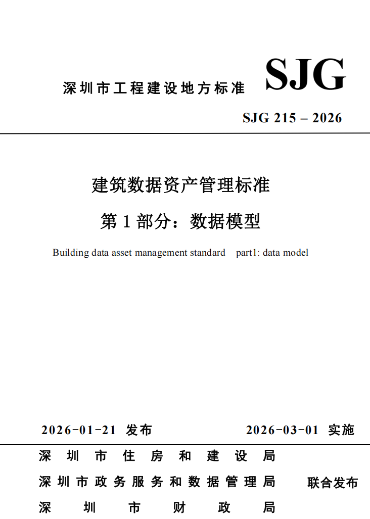 近日,深圳市住房和建设局、深圳市政务服务和数据管理局、深圳市财政局印发通知,发布深圳市工程建设地方标准《建筑数据资产管理标准 第1部分:数据模型》,编号为SJG 215-2026,自2026年3月1日起实施。