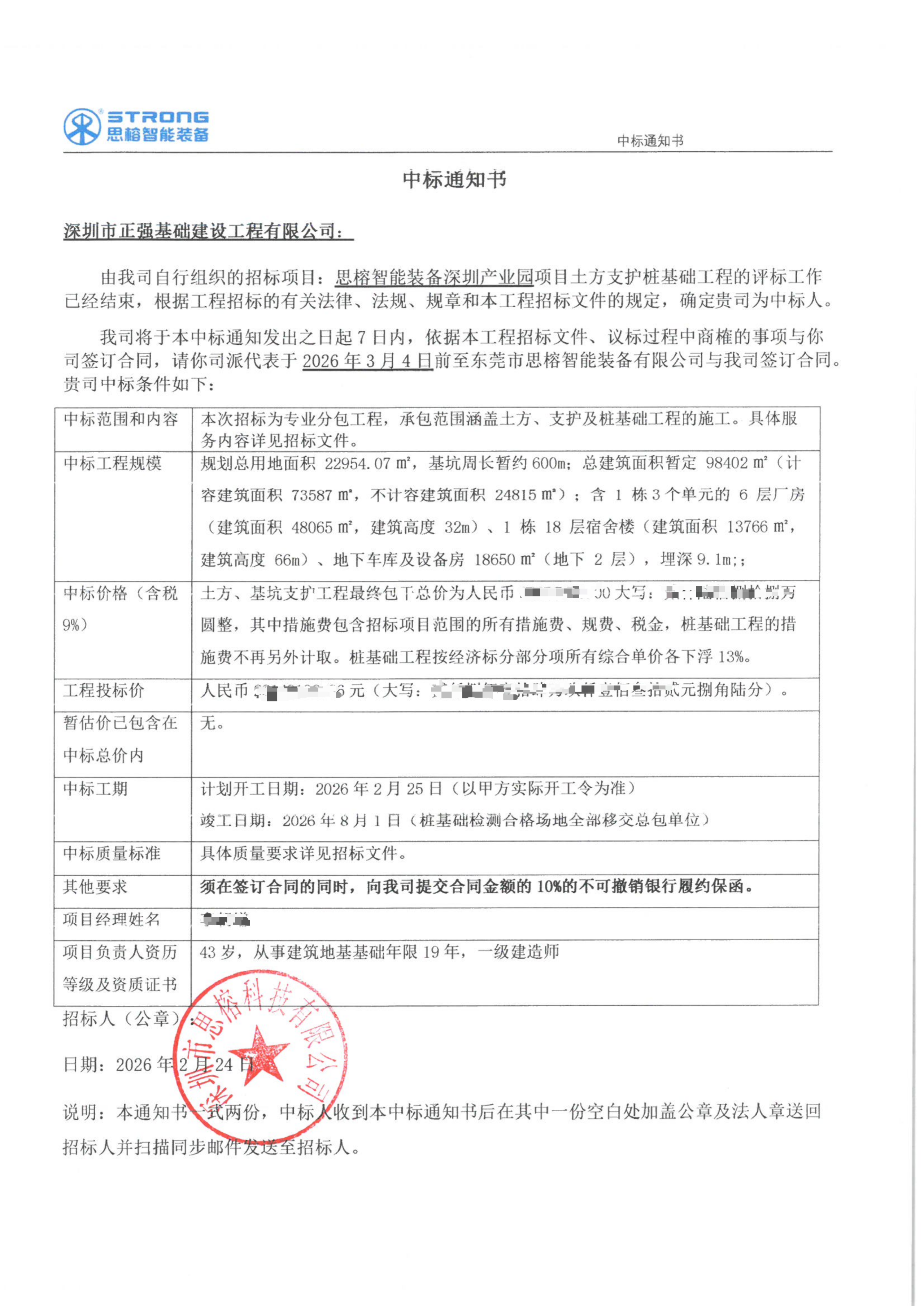 鹏城春来早,奋进正当时。深圳市正强基础建设工程有限公司锚定高质量发展目标,抢抓市场发展机遇,于2026年2月24日成功中标思榕智能装备深圳产业园项目基坑支护、土石方、桩基础工程。此次中标,打响了公司新年“实干担当、高质量发展”的第一枪,喜提马年“开门红”!