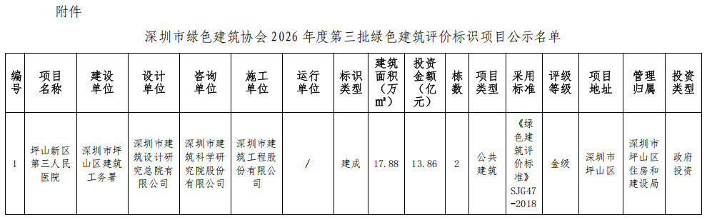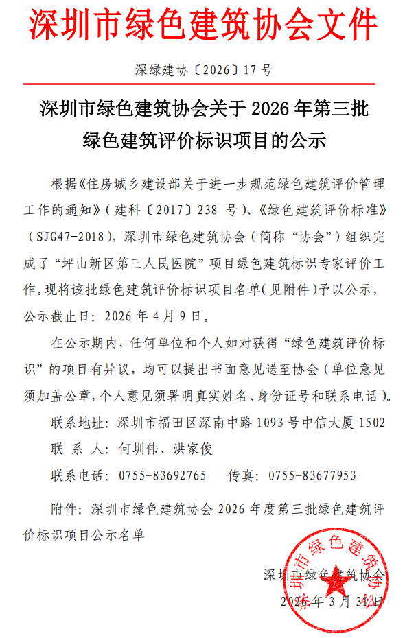 深圳市绿色建筑协会关于2026年第三批绿色建筑评价标识项目的公示