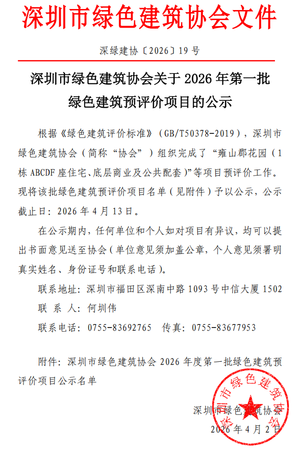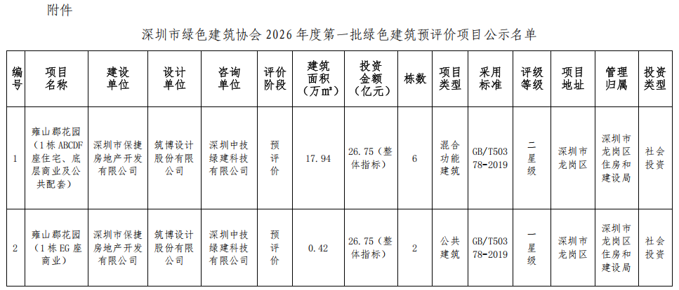 深圳市绿色建筑协会关于2026年第一批绿色建筑预评价项目的公示