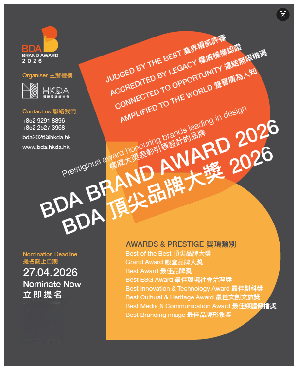 “BDA顶尖品牌大奖”由香港设计师协会(HKDA)主办,奖项结合设计专业领域与创新实践者的评审视角,无论申报主体为推动永续发展的企业、具备突破创新能力的科创品牌、承载文化内涵的创意机构,或者是正致力于提升品牌声量与信任度的成长型企业,BDA均可为其提供具备公信力的品牌价值彰显与信任背书平台。