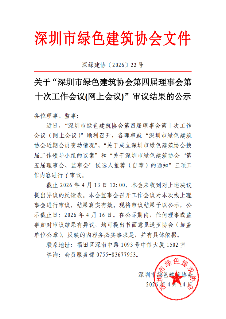 关于“深圳市绿色建筑协会第四届理事会第十次工作会议”审议结果的公示