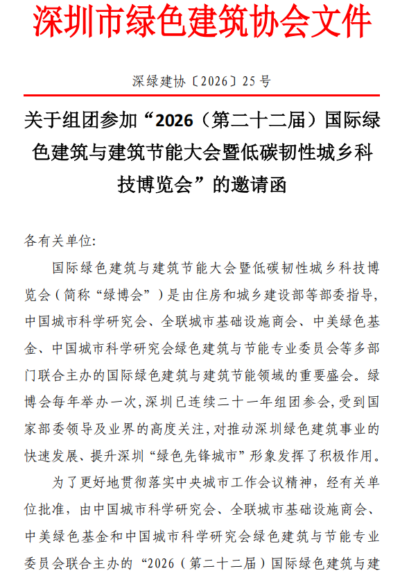 深圳市绿色建筑协会关于组团参加“2026(第二十二届)国际绿色建筑与建筑节能大会暨低碳韧性城乡科技博览会”的邀请函