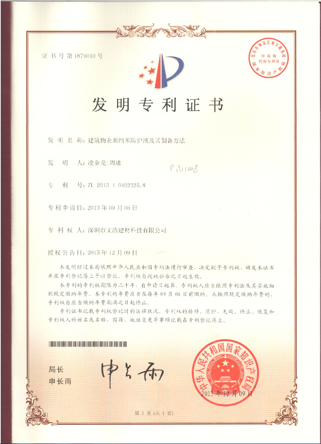 文浩建材自主研发的建筑物表面纳米防护技术喜获国家发明专利,该产品集防水、防毒、自洁、防紫外线、防涂鸦等功能于一体,适应于各类建筑饰面外墙和屋面、各类公共设施、家纺用品、衣服鞋帽、汽车玻璃等表面防护!欢迎各界朋友莅临指导和咨询:0755-83551196