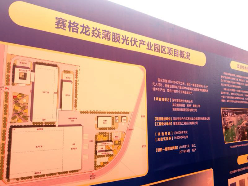 2018年1月8日,赛格龙焱薄膜光伏产业园区在深汕特别合作区正式动工建设,计划在15个月内建成投产。该项目以“深圳总部+深汕基地”模式建设,一期将建设2条碲化镉薄膜太阳能电池组件生产线,其产品将填补深圳在薄膜太阳能电池制造和应用领域内的空白。
