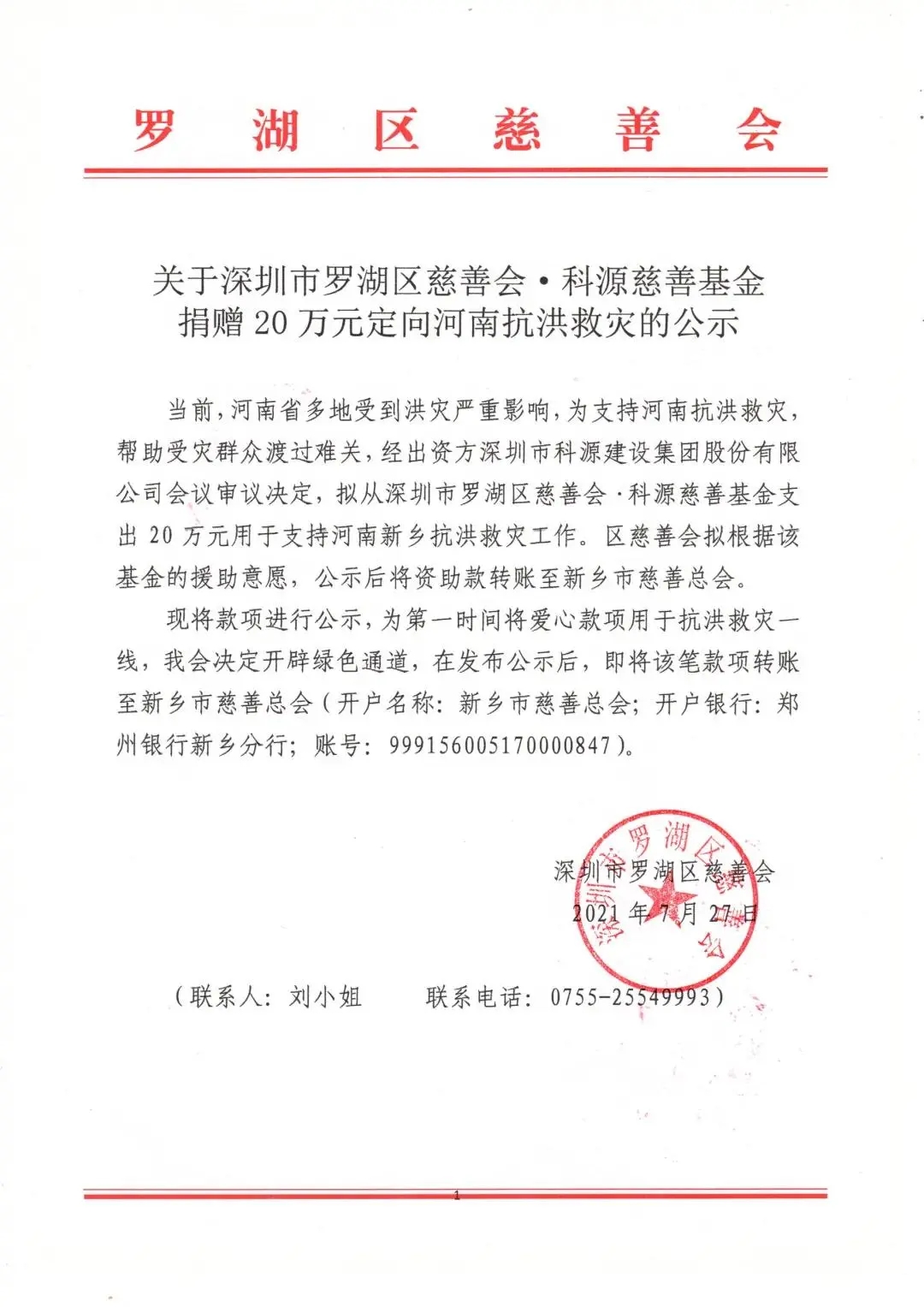 近期,河南省多地受到洪灾严重影响,为支持河南抗洪救灾帮助受灾群众渡过难关,经出资方深圳市科源建设集团股份有限公司会议审议决定,拟从深圳市罗湖区慈善会·科源慈善基金支出20万元用于支持河南新乡抗洪救灾工作。罗湖区慈善会拟根据该基金的援助意愿,公示后将资助款转账至新乡市慈善总会,具体如下: