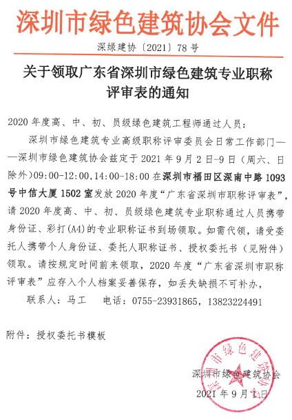 关于领取广东省深圳市绿色建筑专业职称评审表的通知
