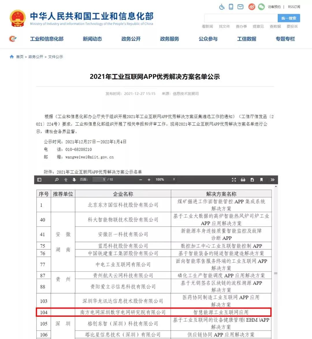 近日,国家工信部公布2021年工业互联网APP优秀解决方案名单,我协会会员单位——南方电网深圳数字电网研究院有限公司(简称“深圳数研院”)申报的“智慧能源工业互联网应用”荣登榜单,成为深圳市6个入选企业之一。这是深圳数研院“智慧能源工业互联网”应用继去年中国第二届工业互联网大赛获奖之后斩获的又一项国家级荣誉。