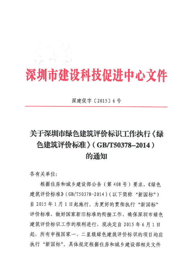 关于深圳市绿色建筑评价标识工作执行《绿色建筑评价标准》(GB/T50378-2014)的通知