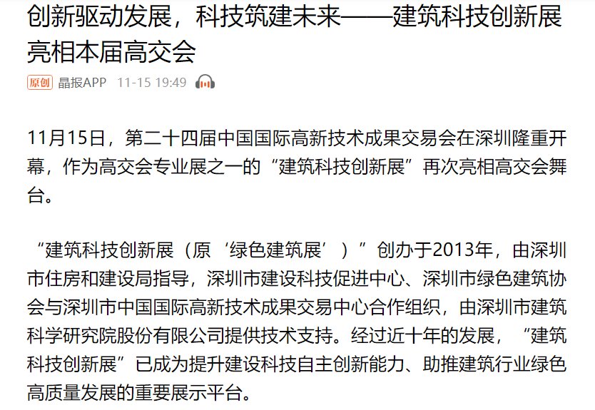 11月15-19日,第二十四届中国国际高新技术成果交易会(以下简称“高交会”)深圳隆重召开,作为高交会专业展之一的“建筑科技创新展”再次亮相高交会舞台。