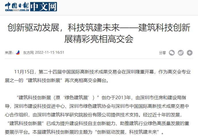 在本届高交会上,“建筑科技创新展”凭借众多创新建筑科技产品和技术,成为大会一道靓丽的风景线。光明日报、“学习强国”平台、第一财经、深圳特区报、深圳商报、晶报等主流媒体,新浪网、凤凰网、网易新闻、中国日报网、读特新闻等门户网站及骏绿网等行业媒体纷纷对“建筑科技创新展”进行报道,引发社会关注。