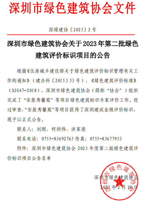 深圳市绿色建筑协会关于2023年第二批绿色建筑评价标识项目的公告