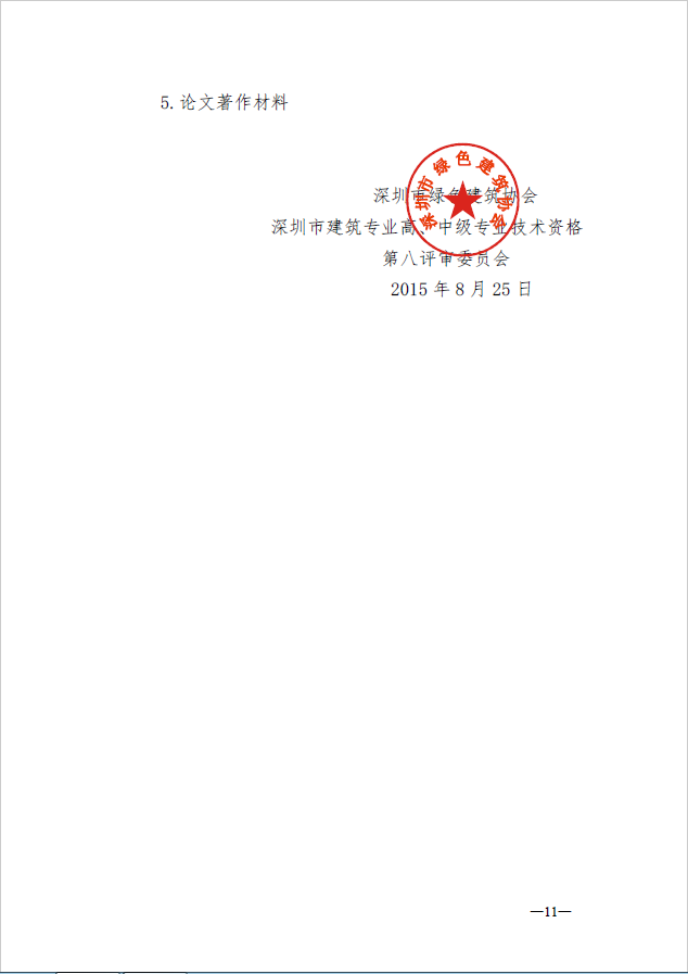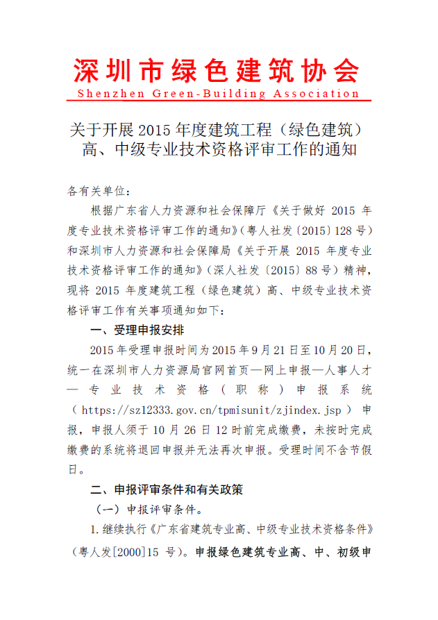 关于开展深圳市2015年度建筑工程(绿色建筑)高、中级专业技术资格评审工作的通知(深圳市绿色建筑协会)