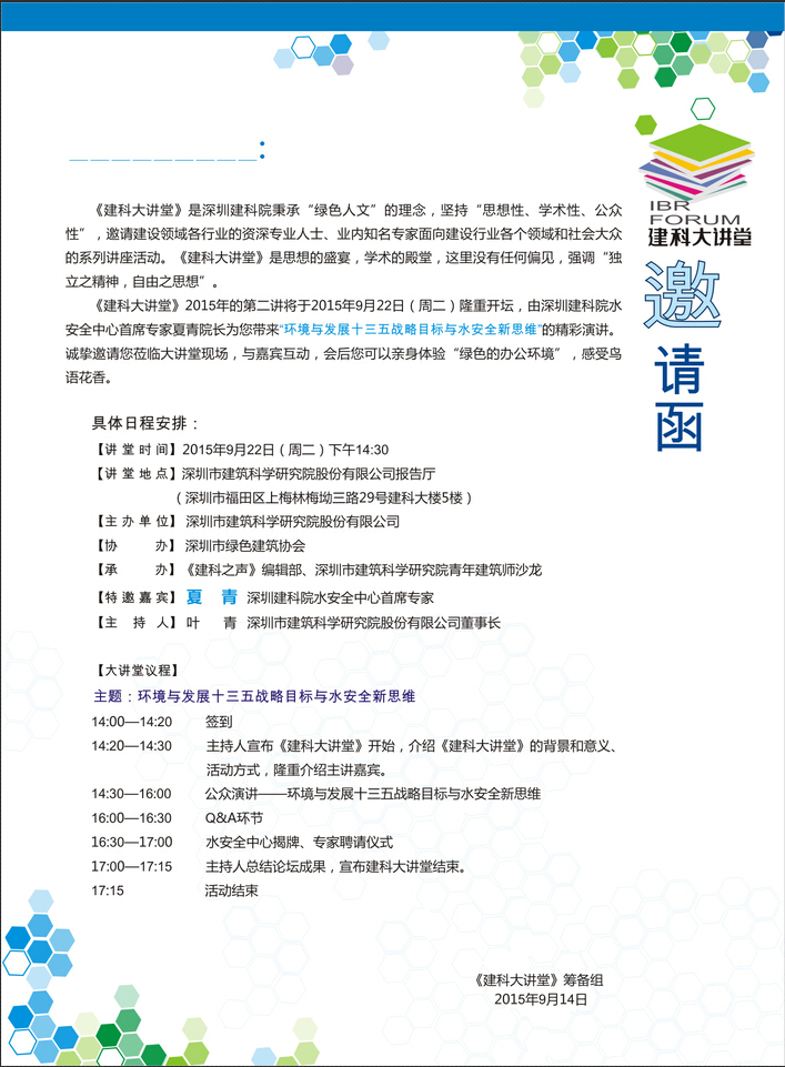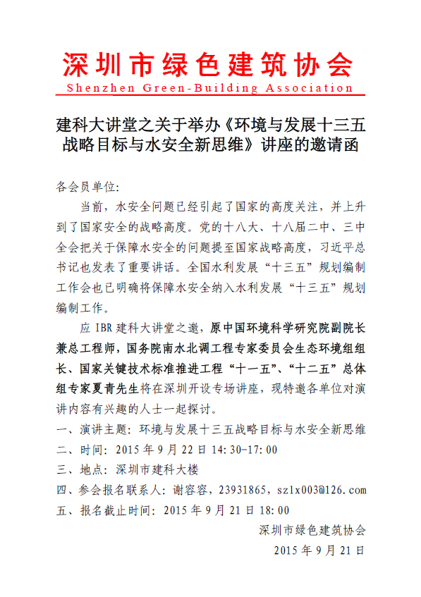关于举办《环境与发展十三五战略目标与水安全新思维》讲座的邀请函