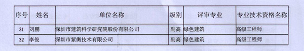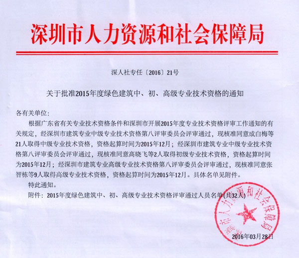 附件:深圳市人力资源和社会保障局《关于批准2015年度绿色建筑中、初、高级专业技术资格的通知》