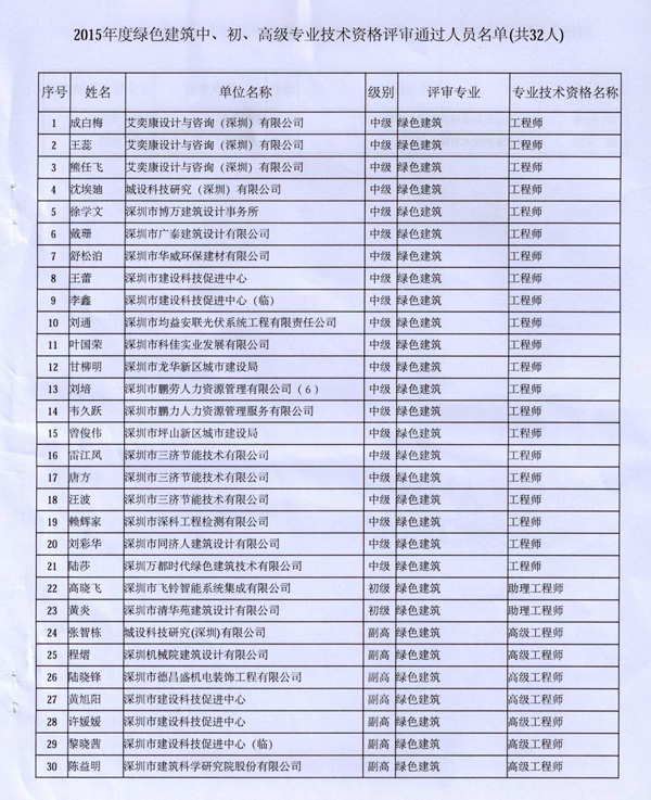 根据广东省有关专业技术资格条件和深圳市开展2015年度专业技术资格评审工作通知的有关规定,经深圳市建筑专业中级专业技术资格第八评审委员会日常工作部门深圳市绿色建筑协会评审通过,现核准同意成白梅等21人取得中级专业技术资格,资格起算时间为2015年12月;经深圳市建筑专业中级专业技术资格第八评审委员会日常工作部门深圳市绿色建筑协会评审通过,现核准同意高晓飞等2人取得初级专业技术资格,资格起算时间为2015年12月;经深圳市建筑专业中级专业技术资格第八评审委员会日常工作部门深圳市绿色建筑协会评审通过,现核准同意成白梅等9人取得高级专业技术资格,资格起算时间为2015年12月。具体名单见附件。