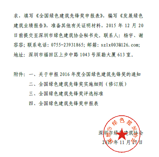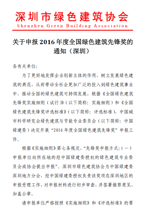 关于申报2016年度全国绿色建筑先锋奖的通知(深圳)