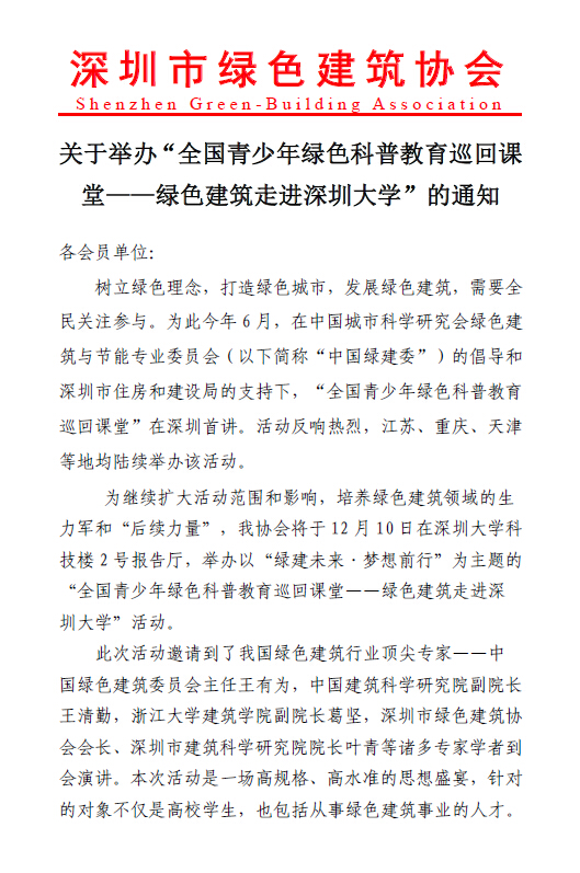 关于举办“全国青少年绿色科普教育巡回课堂-绿色建筑走进深圳大学”的正式通知