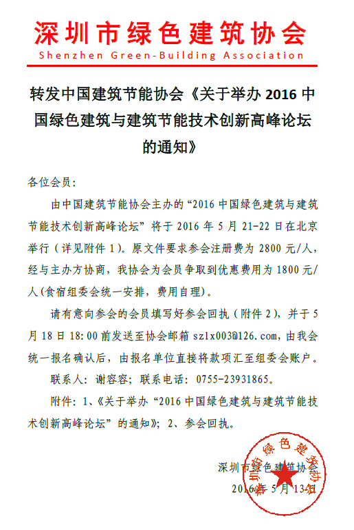 转发中国建筑节能协会《关于举办2016中国绿色建筑与建筑节能技术创新高峰论坛的通知》