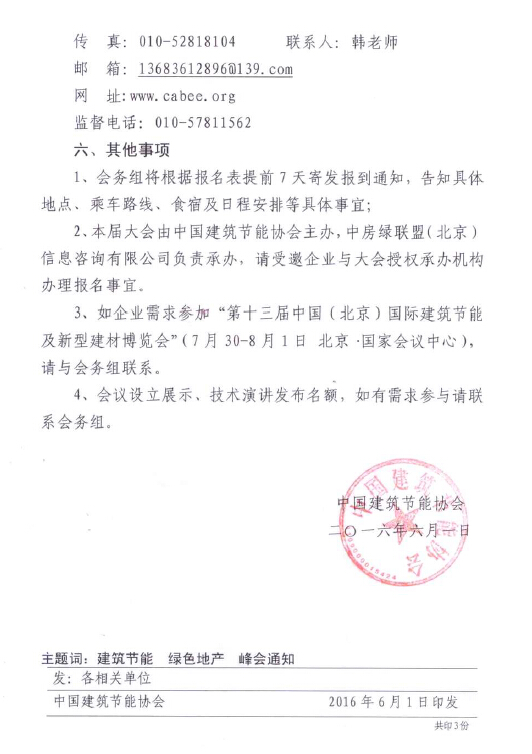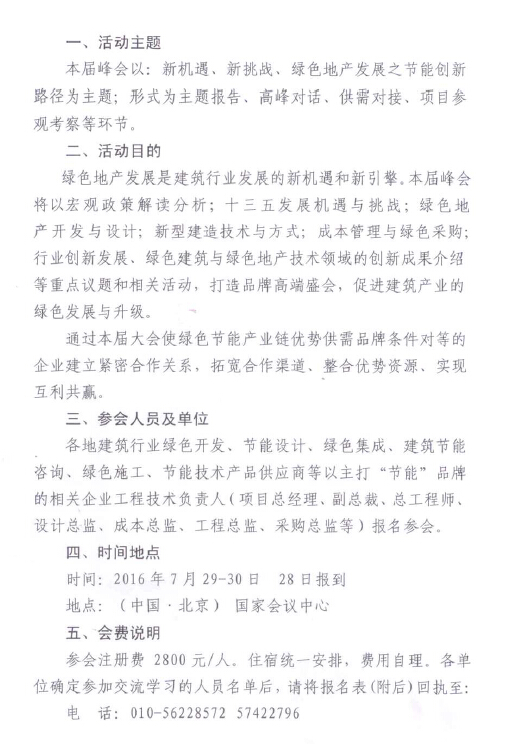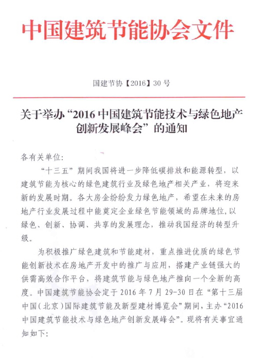 由中国建筑节能协会主办的“2016中国建筑节能技术与绿色地产创新发展峰会”将于2016年7月29-30日在北京举办。会议注册费2800元/人,经我协会争取,各位会员可享受优惠价1800元/人,欢迎踊跃参加。报名截止日期:2016年7月20日,报名联系电话:0755-23931865,谢小姐。
