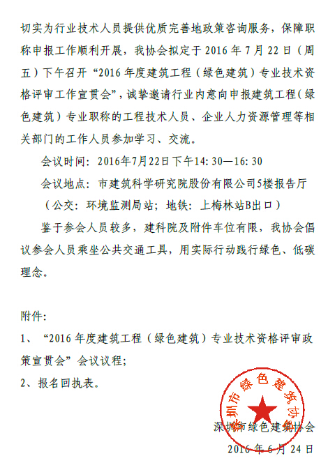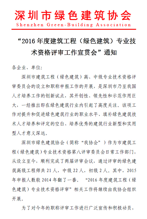 2016年度绿色建筑工程师职称申报政策宣贯会通知