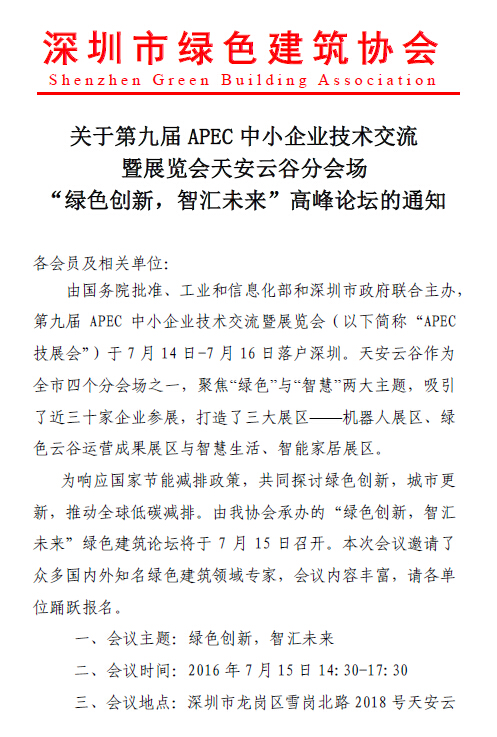 关于举办APEC技展会天安云谷分会场“绿色创新,智汇未来”高峰论坛的通知