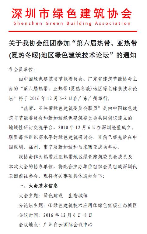 关于组团参加“第六届热带、亚热带(夏热冬暖)地区绿色建筑技术论坛”的通知