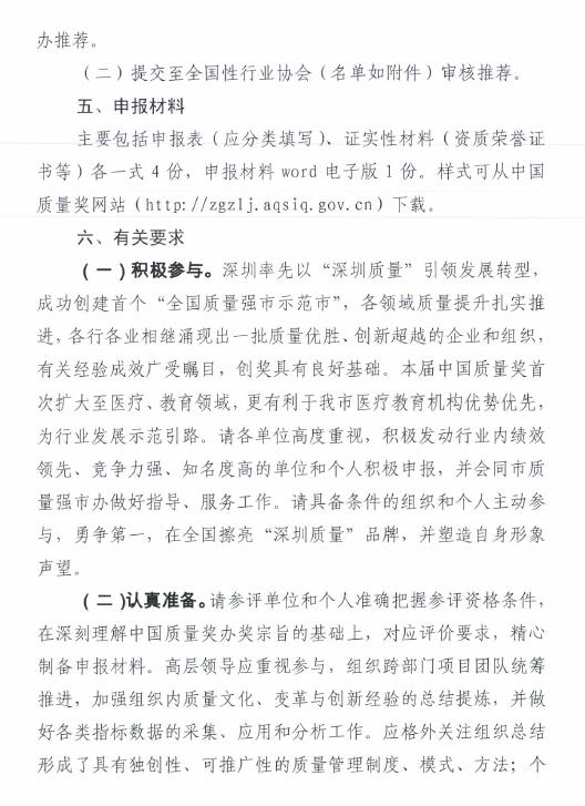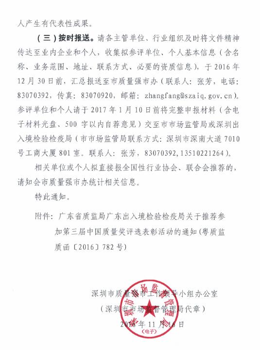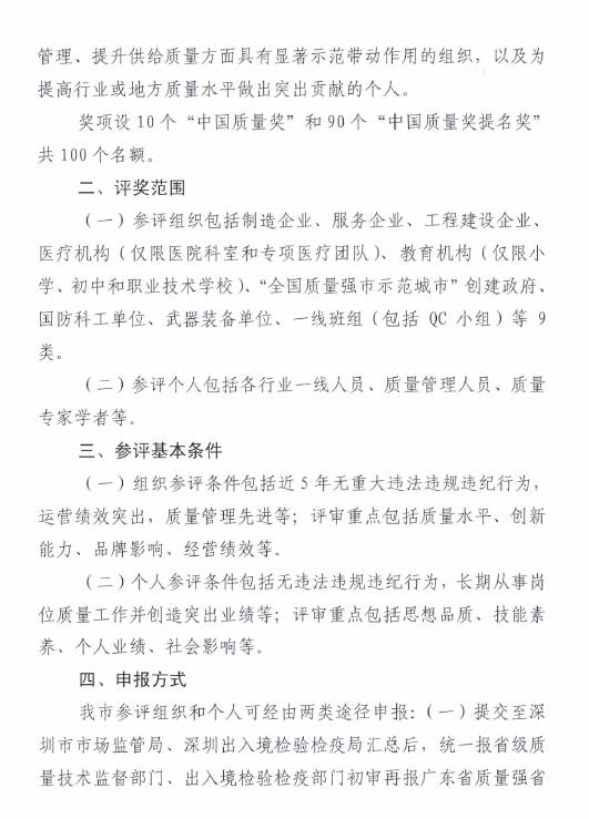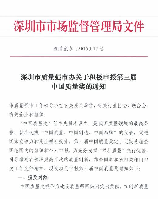 深圳市质量强市办关于积极申报第三届中国质量奖的通知