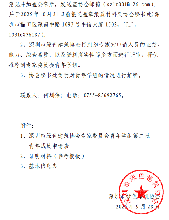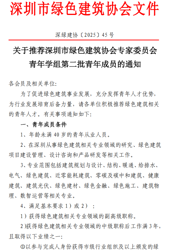 附件1:关于推荐深圳市绿色建筑协会专家委员会青年学组第二批青年成员的通知