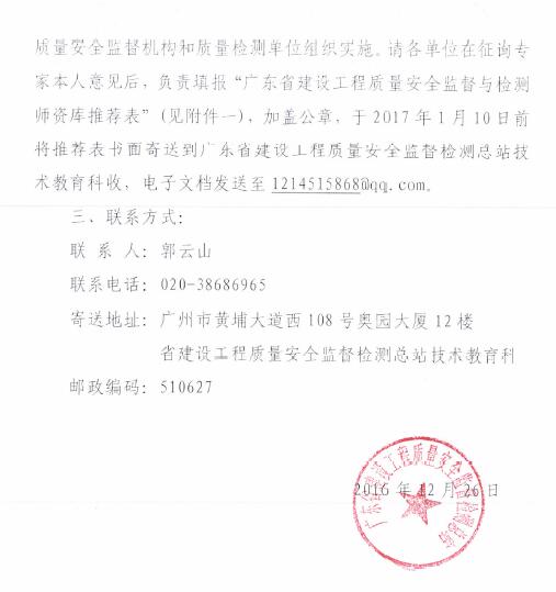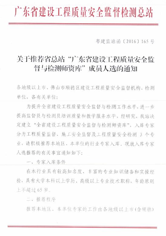 转:省质监总站关于“广东省建设工程质量安全监督与检测师资库”成员人选的通知