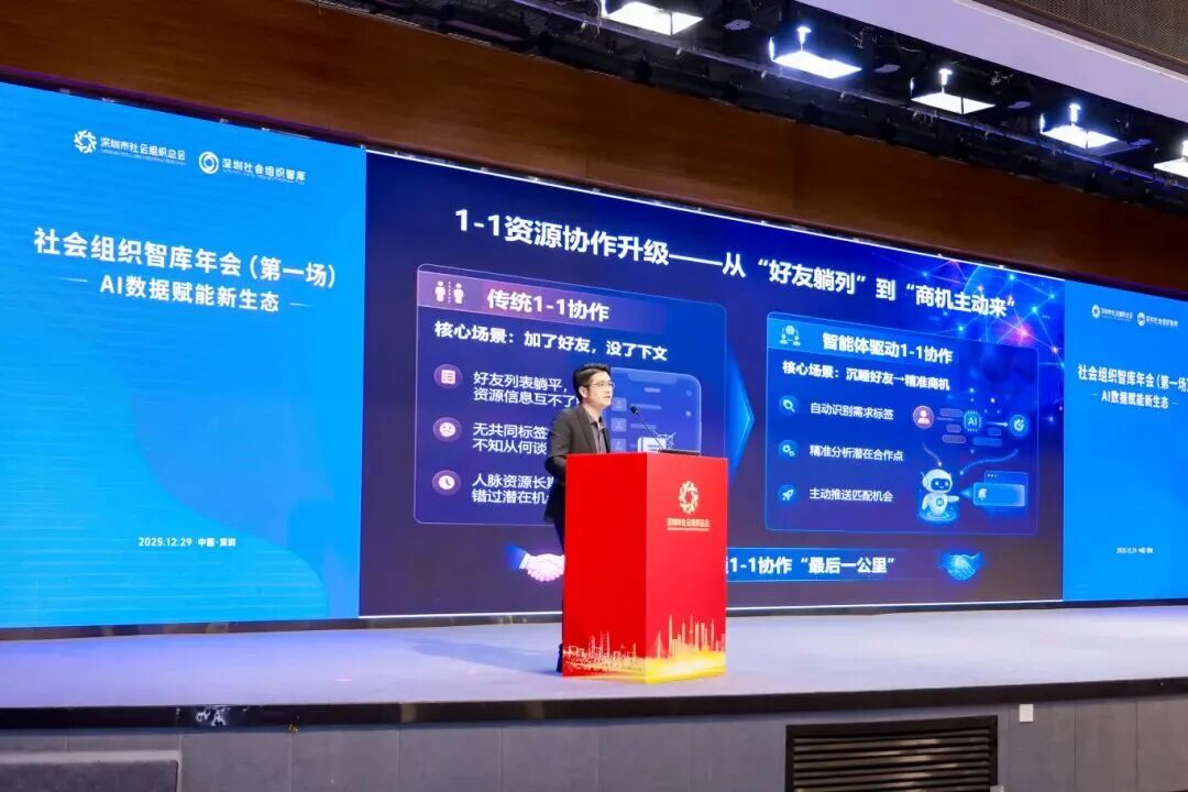 大会同期举办的社会组织智库年会(第一场)以“AI数据赋能新生态”为主题,由总会常务秘书长徐辉主持。四位行业专家分别从不同维度带来干货分享:人民数据深圳联合实验室负责人苏箭解读AI重构社会组织资源协作新生态的路径;人民数据副总经理刘文中立足深圳实践与全球视野,剖析可信数据生态建设;工商银行深圳市分行杨洪分享数字金融助力社会组织及会员企业数智化升级的实操方案;深圳市代理记账行业协会会长彭松林则结合商协会运营实践,阐述标准化、数字化转型经验。