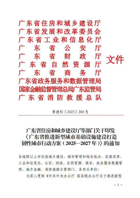 为贯彻党的二十大和二十届历次全会精神,落实中共中央办公厅、国务院办公厅关于推进新型城市基础设施建设、打造韧性城市决策部署和住房城乡建设部等部门相关贯彻落实文件的要求,近日,广东省住房和城乡建设厅联合省发展改革委、工业和信息化厅、公安厅、财政厅、自然资源厅、商务厅、政务和数据局、广东金融监管局、省消防救援总队等9部门印发《广东省推进新型城市基础设施建设打造韧性城市行动方案(2025—2027年)》(以下简称《行动方案》)。