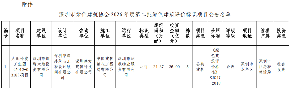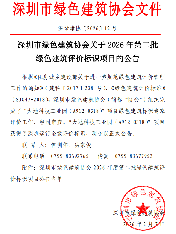 深圳市绿色建筑协会关于2026年第二批绿色建筑评价标识项目的公告
