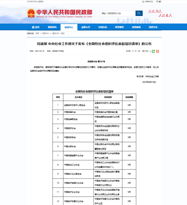 民政部 中央社会工作部关于发布《全国性社会组织评比表彰项目清单》的公告网址:https://www.mca.gov.cn/n152/n165/c1662004999980004737/content.html