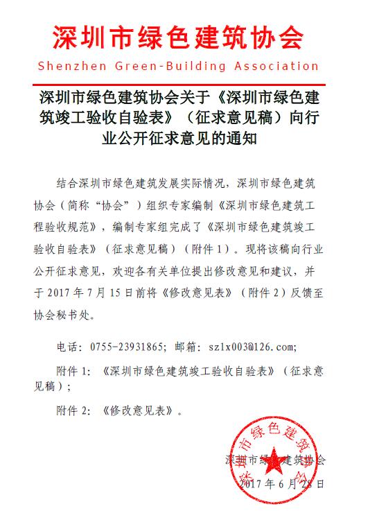 关于《深圳市绿色建筑竣工验收自验表》(征求意见稿)向行业公开征求意见的通知