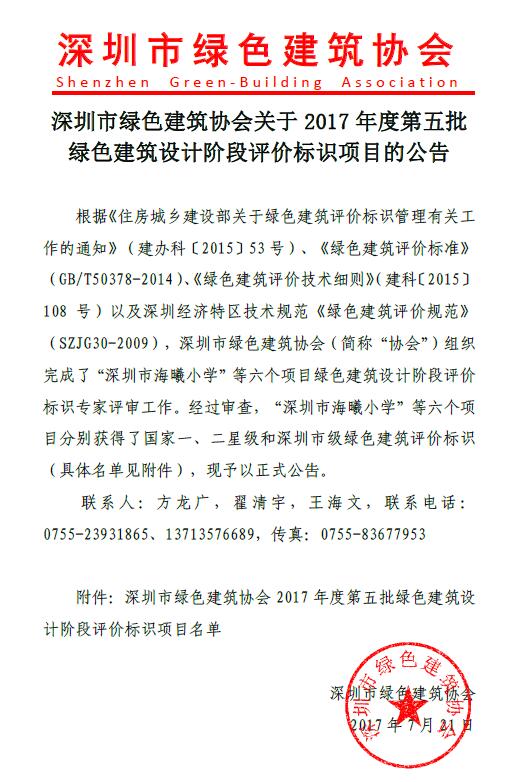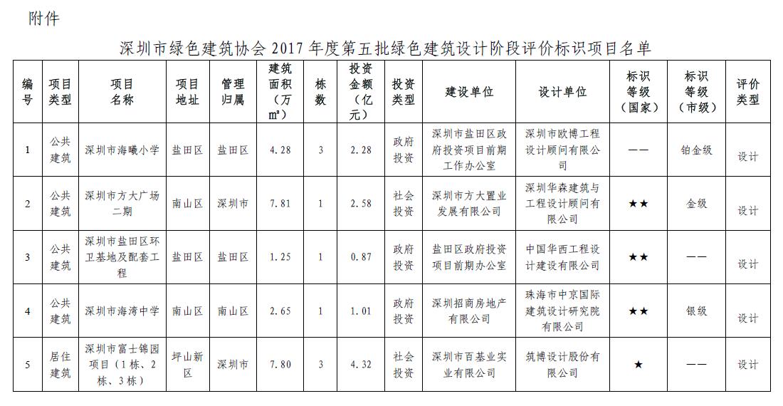 关于2017年度第五批绿色建筑设计阶段评价标识项目的公告