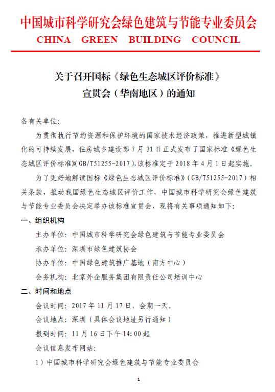 关于召开国标《绿色生态城区评价标准》宣贯会(华南地区)的通知