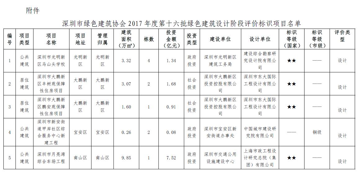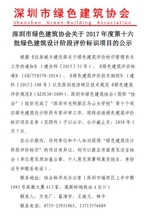 关于2017年度第十六批绿色建筑设计阶段评价标识项目公示