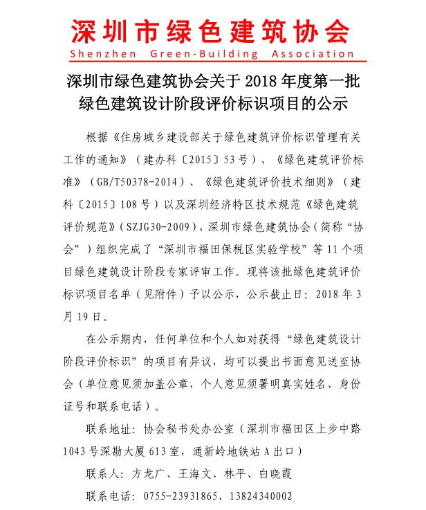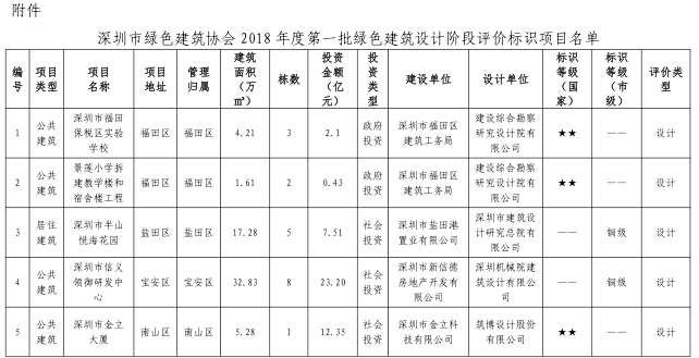 深圳市绿色建筑协会关于2018年度第一批绿色建筑设计阶段评价标识项目的公示