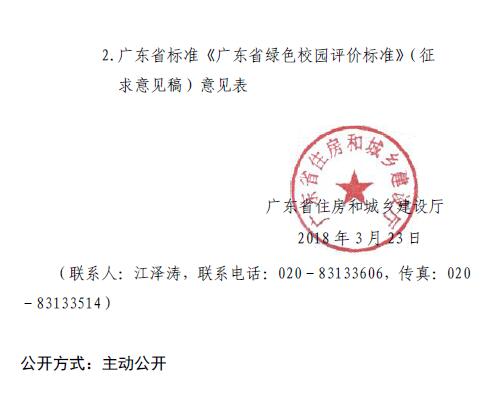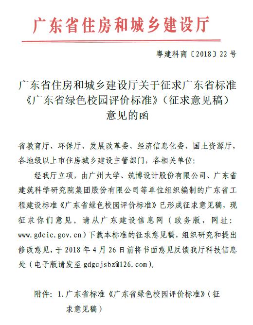 各位会员,现将广东省住房和建设厅《关于征求广东省标准<广东省绿色校园评价标准>(征求意见稿)意见的函》转发给你们,请大家积极参与,针对【附件1】踊跃提出相关建议或意见,填写好【附件2】后,于4月20日前将【附件2】发回到 协会邮箱szlx003@126.com。